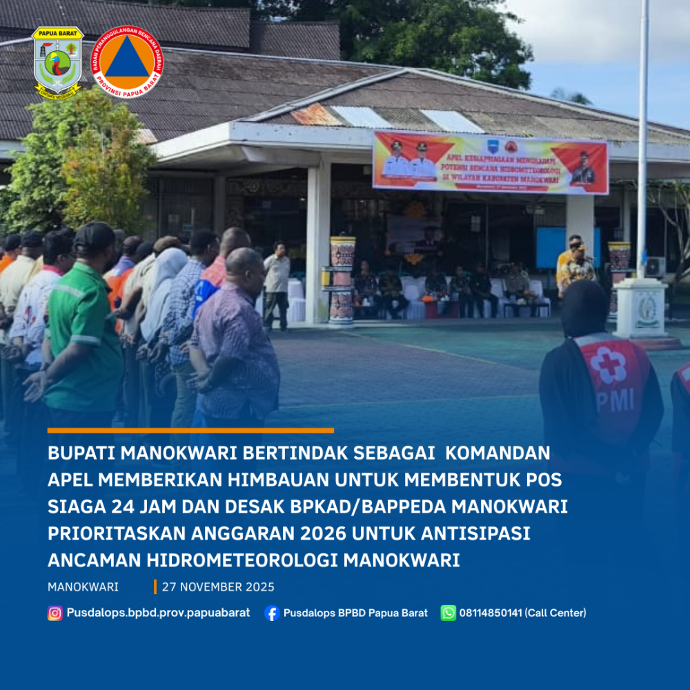 MANOKWARI, 27 November 2025 – Pemerintah Kabupaten Manokwari melaksanakan Apel Kesiapsiagaan Menghadapi Potensi Ancaman Bencana Hidrometeorologi Tahun 2025. Apel yang digelar hari ini bertujuan untuk memperkuat sinergi lintas sektor dalam upaya mitigasi dan penanggulangan bencana di wilayah Manokwari.